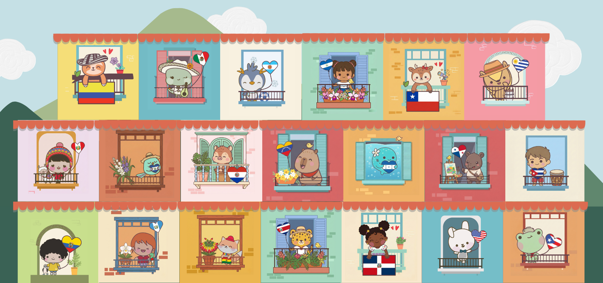 Bilingual Latino character Padu from Chile standing on a balcony with the Chilean flag, representing Chilean culture and the Spanish language.
